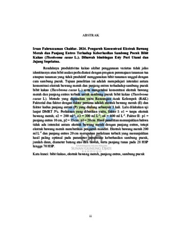 Chaidar, Irsan Fahruzzaman (2025) Pengaruh konsentrasi ekstrak bawang merah dan panjang entres terhadap keberhasilan sambung pucuk bibit kakao (Theobroma Cacao L.)". Sarjana thesis, UIN Sunan Gunung Djati Bandung.