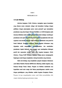 Kampanye Public Relations merupakan serangkaian aktivitas komunikasi yang dilakukan secara persuasif bertujuan mempengaruhi khalayak. Tingginya angka penyalahgunaan obat-obatan terlarang, pergaulan bebas, dan pengaruh negatif dalam pertemanan menjadi hal serius untuk dicegah. BNN Kota Bandung melakukan kegiatan Kampanye Public Relations bertujuan memberikan edukasi dan pembentukan ketahanan diri remaja terhadap penyalahgunaan narkoba serta menciptakan lingkungan pertemanan yang positif sejak dini. Penelitian ini dilakukan bertujuan untuk mengetahui Aktivitas Kampanye Public Relations P4GN dalam Program Remaja Teman Sebaya yang dilakukan oleh BNN Kota Bandung melalui model Kampanye Public Relations PIE yang dikemukakan oleh Randy Bobbitt dan Ruth Sullivan. Model kampanye humas ini terdiri dari tiga elemen yaitu Planning, Implementation, and Evaluation. Penelitian ini menggunakan metode desktiptif kualitatif dengan paradigman konstruktivisme. Teknik pengumpulan data dilakukan dengan wawancara, observasi, dan dokumentasi. Data dianalisis melalui tahapan reduksi data, penyajian data, dan penarikan kesimpulan. Fokus penelitian diarahkan pada tahapan model kampanye humas PIE diterapkan dalam pelaksanaan program kampanye humas. Hasil penelitian menunjukan Kampanye Public Relations P4GN Remaja Teman Sebaya oleh BNN Kota Bandung dilaksanakan melalui perencanaan, pelaksanaan, dan evaluasi dengan memanfaatkan media yang dekat dengan remaja. Pendekatan partisipatif dan berbasis kebutuhan audiens menjadi kunci keberhasilan dalam meningkatkan pemahaman, sikap, dan ketahanan diri remaja terhadap bahaya narkoba. BNN Kota Bandung menjalankan program Kampanye Public Relations dengan dikaitkan pada model kampanye humas PIE melalui tiga tahapan yang dilakukan meliputi: (1) Planning berfokus pada identifikasi target audiens, pembentukan tim pelaksana, dan merancang pesan kampanye. (2) Implementation berfokus pada pelaksanaan kampanye secara tatap muka, memanfaatkan media digital, dan media radio. (3) Evaluation dilakukan dengan penyebaran angket dan analisis dampak kampanye.