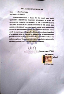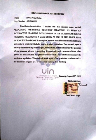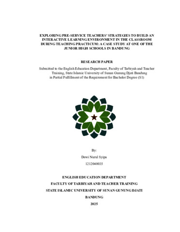 Syipa, Dewi Nurul (2025) Exploring pre-service teachers’ strategies to build an interactive learning environment in the classroom during teaching practicum: A case study at one of the Junior High Schools in Bandung. Sarjana thesis, UIN Sunan Gunung Djati Bandung.
