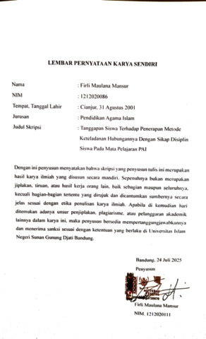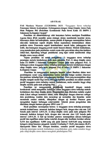 Mansur, Firli Maulana (2025) Tanggapan siswa terhadap penerapan metode keteladanan hubungannya dengan sikap disiplin siswa pada mata pelajaran PAI: Penelitian korelasional pada siswa kelas IX SMPN 2 Sukaresmi kabupaten Cianjur. Sarjana thesis, UIN Sunan Gunung Djati Bandung.