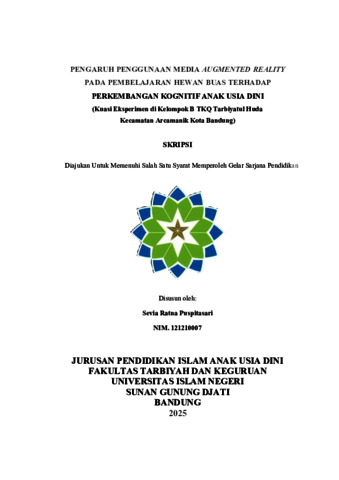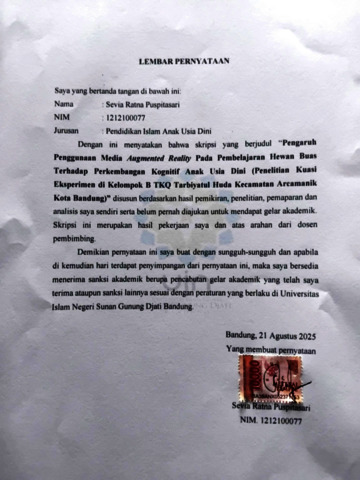 Puspitasari, Sevia Ratna (2025) Pengaruh penggunaan media Augmented Reality pada pembelajaran hewan buas terhadap perkembangan kognitif anak usia dini: Kuasi eksperimen di Kelompok B TKQ Tarbiyatul Huda Kecamatan Arcamanik Kota Bandung. Sarjana thesis, UIN Sunan Gunung Djati Bandung.