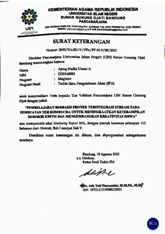 Abdillah, Ajeng Nadia Utami (2025) Pembelajaran berbasis proyek terintegrasi stream pada pembuatan teh kombucha untuk meningkatkan keterampilan berpikir kritis dan mengembangkan kreativitas siswa. Masters thesis, UIN Sunan Gunung Djati Bandung.