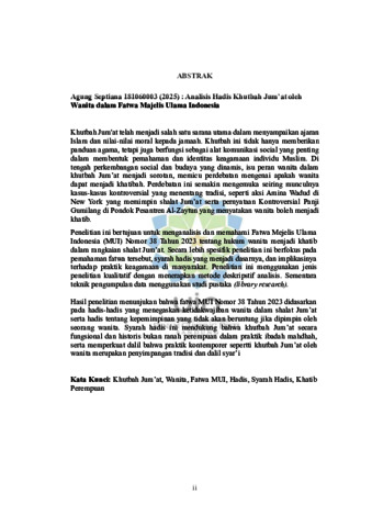 | Uncontrolled Keywords: | Khutbah Jum’at; Wanita; Fatwa MUI; Hadis; Syarah Hadis; Khatib Perempuan |