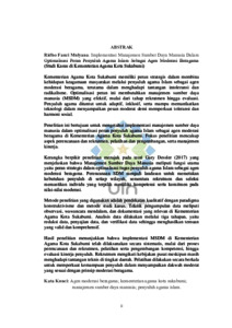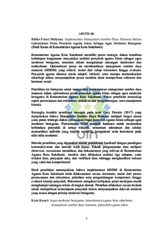 INDONESIA: Kementerian Agama Kota Sukabumi memiliki peran strategis dalam membina kehidupan keagamaan masyarakat melalui penyuluh agama Islam sebagai agen moderasi beragama, terutama dalam menghadapi tantangan intoleransi dan radikalisme. Optimalisasi peran ini membutuhkan manajemen sumber daya manusia (MSDM) yang efektif, mulai dari tahap rekrutmen hingga evaluasi. Penyuluh agama dituntut untuk adaptif, inklusif, serta mampu memanfaatkan teknologi dalam menyampaikan pesan moderat demi memperkuat toleransi dan harmoni sosial. Penelitian ini bertujuan untuk mengetahui implementasi manajemen sumber daya manusia dalam optimalisasi peran penyuluh agama Islam sebagai agen moderasi beragama di Kementerian Agama Kota Sukabumi. Fokus penelitian mencakup aspek perencanaan dan rekrutmen, pelatihan dan pengembangan, serta manajemen kinerja. Kerangka berpikir penelitian merujuk pada teori Gary Dessler (2017) yang menjelaskan bahwa Manajemen Sumber Daya Manusia meliputi fungsi utama yaitu peran strategis dalam optimalisasi tugas penyuluh agama Islam sebagai agen moderasi beragama. Perencanaan SDM menjadi landasan untuk memetakan kebutuhan penyuluh di setiap wilayah, sementara rekrutmen dan seleksi memastikan individu yang terpilih memiliki kompetensi serta komitmen pada nilai-nilai moderasi. Metode penelitian yang digunakan adalah pendekatan kualitatif dengan paradigma konstruktivisme dan metode studi kasus. Teknik pengumpulan data meliputi observasi, wawancara mendalam, dan dokumentasi yang relevan di Kementerian Agama Kota Sukabumi. Analisis data dilakukan melalui tiga tahapan, yaitu reduksi data, penyajian data, dan verifikasi data sehingga menghasilkan temuan yang valid dan komprehensif. Hasil penelitian menunjukkan bahwa implementasi MSDM di Kementerian Agama Kota Sukabumi telah dilaksanakan secara sistematis, mulai dari proses perencanaan dan rekrutmen, pelatihan serta pengembangan kompetensi, hingga evaluasi kinerja penyuluh. Rekrutmen mengikuti kebijakan pusat meskipun masih menghadapi tantangan teknis di tingkat daerah. Pelatihan dilakukan secara berkala untuk memperkuat kemampuan penyuluh dalam menyampaikan dakwah moderat yang sesuai dengan prinsip moderasi beragama. Kata kunci: Agen Moderasi beragama; kementerian agama kota Sukabumi; manajemen sumber daya manusia; penyuluh agama Islam. ENGLISH: The Sukabumi City Ministry of Religious Affairs plays a strategic role in fostering community religious life through Islamic religious instructors as agents of religious moderation, particularly in addressing the challenges of intolerance and radicalism. Optimizing this role requires effective human resource management (HRM), from recruitment to evaluation. Religious instructors are required to be adaptive, inclusive, and able to utilize technology to convey messages of moderation to strengthen tolerance and social harmony. This study aims to examine the implementation of human resource management in optimizing the role of Islamic religious instructors as agents of religious moderation at the Sukabumi City Ministry of Religious Affairs. The research focuses on planning and recruitment, training and development, and performance management. The research framework refers to Gary Dessler's theory (2017), which explains that Human Resource Management encompasses a primary function, namely a strategic role in optimizing the duties of Islamic religious instructors as agents of religious moderation. Human resource planning serves as the basis for mapping the needs of instructors in each region, while recruitment and selection ensure that selected individuals possess the competency and commitment to the values of moderation. The research method used is a qualitative approach with a constructivist paradigm and a case study method. Data collection techniques included observation, in-depth interviews, and relevant documentation at the Ministry of Religious Affairs in Sukabumi City. Data analysis was conducted in three stages: data reduction, data presentation, and data verification, resulting in valid and comprehensive findings. The results of the study indicate that the implementation of Human Resources Management (HRM) at the Ministry of Religious Affairs in Sukabumi City has been carried out systematically, from the planning and recruitment process, through training and competency development, to the evaluation of the performance of extension workers. Recruitment follows central government policies, although technical challenges remain at the regional level. Regular training is conducted to strengthen extension workers' abilities in delivering moderate da'wah (Islamic preaching) in accordance with the principles of religious moderation. keywords: Religious moderation agent; ministry of Religious affairs of Sukabumi city; human resource management; islamic Religious instructor.