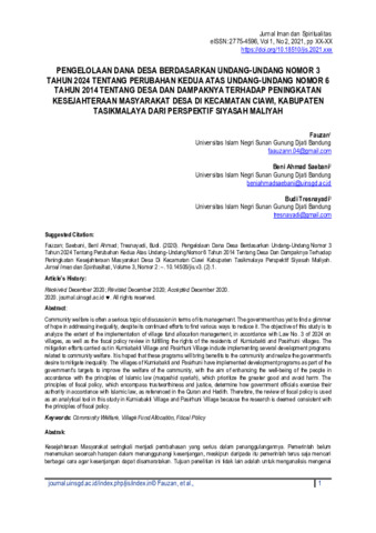 Fauzan, Fauzan and Saebani, Beni Ahmad and Tresnayadi, Budi (2025) Pengelolaan dana desa berdasarkan Undang-Undang nomor 3 tahun 2024 tentang perubahan kedua atas Undang-Undang nomor 6 tahun 2014 tentang desa dan dampaknya terhadap peningkatan kesejahteraan masyarakat desa di Kecamatan Ciawi Kabupaten Tasikmalaya. Jurnal Iman dan Spiritualitas, 1 (2). pp. 1-14. ISSN 2775-4596