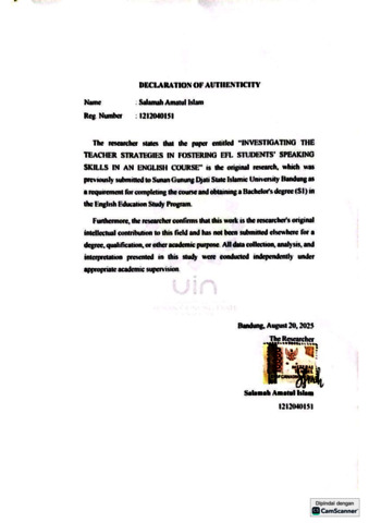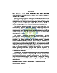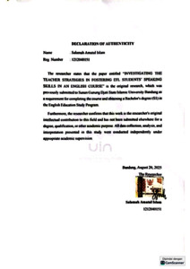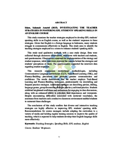 Islam, Salamah Amatul (2025) Investigating the Teacher Strategies in Fostering EFL Students' Speaking Skills in an English Course. Sarjana thesis, UIN Sunan Gunung Djati Bandung.