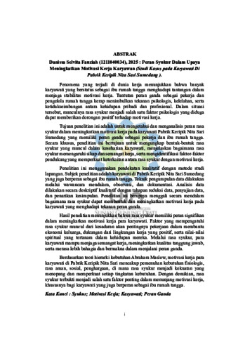 Fenomena yang terjadi di dunia kerja menunjukkan bahwa banyak karyawati yang berstatus sebagai ibu rumah tangga menghadapi tantangan dalam menjaga stabilitas motivasi kerja. Tuntutan peran ganda sebagai pekerja dan pengelola rumah tangga kerap menimbulkan tekanan psikologis,kelelahan, serta ketidakseimbangan antara kehidupan pribadi dan profesional. Dalam situasi tersebut, munculnya rasa syukur menjadi salah satu faktor psikologis yang diduga dapat memberikan dorongan positif terhadap motivasi kerja.Tujuan penelitian ini adalah untuk mengetahui dan menganalisis peran rasa syukur dalam meningkatkan motivasi kerja pada karyawati Pabrik Keripik Nita Sari Sumedang yang memiliki peran ganda sebagai pekerja dan ibu rumah tangga. Secara khusus, penelitian ini bertujuan untuk mengungkap bentuk-bentuk rasa syukur yang muncul dalam keseharian karyawati, menjelaskan bagaimana rasa syukur memengaruhi sikap dan semangat kerja, serta mengidentifikasi faktor-faktor pendukung yang memperkuat keterkaitan antara rasa syukur dengan motivasi kerja. Penelitian ini menggunakan pendekatan kualitatif dengan metode studi lapangan. Subjek penelitian adalah karyawati di Pabrik Keripik Nita Sari Sumedang yang juga berperan sebagai ibu rumah tangga. Teknik pengumpulan data dilakukan melalui wawancara mendalam, observasi, dan dokumentasi. Analisis data dilakukan secara deskriptif kualitatif dengan tahapan reduksi data, penyajian data, dan penarikan kesimpulan. Penelitian ini berupaya menggali secara mendalam bagaimana rasa syukur dapat membentuk dan meningkatkan motivasi kerja pada karyawati yang menghadapi tekanan peran ganda. Hasil penelitian menunjukkan bahwa rasa syukur memiliki peran signifikan dalam meningkatkan motivasi kerja para karyawati. Faktor yang mempengatuhi rasa syukur muncul dari kesadaran akan pentingnya pekerjaan dalam membantu ekonomi keluarga, dukungan dari lingkungan kerja yang positif, serta nilai-nilai spiritual yang tertanam dalam kehidupan mereka. Melalui rasa syukur, para karyawati mampu menjaga semangat kerja, meningkatkan kualitas tanggung jawab, serta merasa lebih bahagia dan bermakna dalam menjalani peran ganda. Berdasarkan teori hierarki kebutuhan Abraham Maslow, motivasi kerja para karyawati di Pabrik Keripik Nita Sari mencakup pemenuhan kebutuhan fisiologis, rasa aman, sosial, penghargaan, di mana rasa syukur menjadi kekuatan yang menopang dan memperkuat setiap tingkatan kebutuhan. Dengan demikian, rasa syukur terbukti menjadi salah satu faktor penting dalam menunjang motivasi kerja, khususnya bagi karyawati yang juga berperan sebagai ibu rumah tangga.