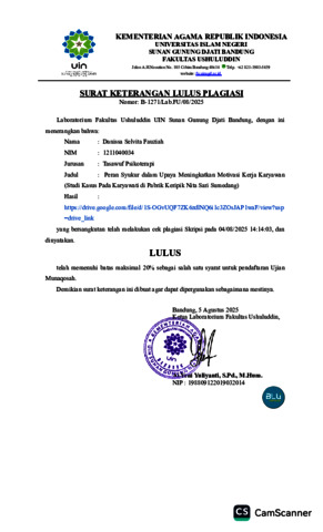 Fauziah, Danissa Selvita (2025) Peran syukur dalam upaya meningkatkan motivasi kerja: Studi kasus pada karyawati di Pabrik Keripik Nita Sari Sumedang. Sarjana thesis, UIN Sunan Gunung Djati Bandung.