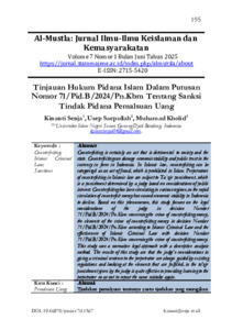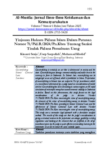 Senja, Kinanti and Saepullah, Usep and Kholid, Muhamad (2025) Tinjauan hukum pidana Islam dalam putusan nomor 71/Pid.B/2024/Pn.Kbm tentang sanksi tindak pidana pemalsuan uang. Al-Mustla: Jurnal Ilmu-Ilmu Keislaman dan Kemasyarakatan, 7 (1). pp. 195-218. ISSN 2715-5420