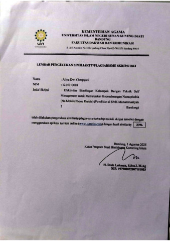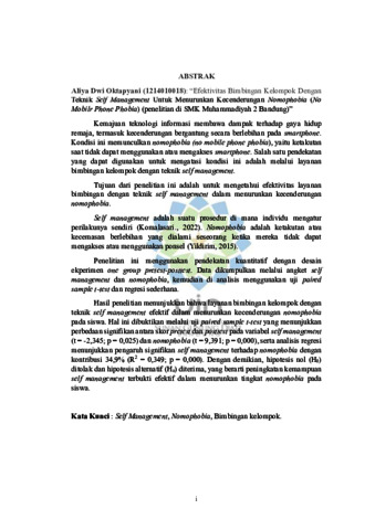 Oktapyani, Aliya Dwi (2025) Efektivitas bimbingan kelompok dengan teknik self management untuk menurunkan kecenderungan nomophobia (no mobile phone phobia): Penelitian di SMK Muhammadiyah 2 Bandung. Sarjana thesis, UIN Sunan Gunung Djati Bandung.