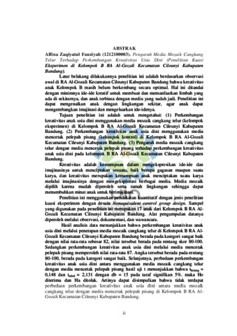 Pengaruh media Mozaik Cangkang Telur terhadap perkembangan kreativitas Anak Usia Dini : Penelitian kuasi eksperimen di kelompok B RA Al-Gozali Kecamatan Cileunyi Kabupaten Bandung