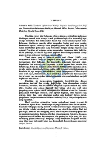 INDONESIA: Penelitian ini di latar belakangi oleh pentingnya optimalisasi pelayanan bimbingan manasik akbar sebagai bentuk pembinaan bagi calon Jemaah haji agar mampu memahami dan melaksanakan ibadah haji sesuai tuntunan syariat islam. Pelayanan bimbingan manasik akbar merupakan bagian dari tugas penting kementerian agama, khususnya seksi penyelenggaraan haji dan umrah, yang di tuntut memberikan pelayanan yang berkualitas dengan kinerja pegawai yang optimal. Penelitian ini bertujuan untuk menganalisis bagaimana faktor individu, faktor psikologis, dan faktor organisasi berperan dalam mengoptimalkan kinerja pegawai dalam pelayanan bimbingan manasik akbar. Teori utama yang di gunakan adalah teori Gibson (1997), yang menyebutkan bahwa kinerja di pengaruhi oleh tiga variabel, yaitu : individu (kemampuan, latar belakang, dan demografi), psikologis (persepsi, sikap, kepribadian, dan motivasi), serta organisasi (struktur, sumber daya, imbalan, dan beban kerja). Selain itu, indikator kinerja menurut Robbins (2006) digunakan untuk menilai kualitas, kuantitas, ketepatan waktu, efektivitas, dan kemandirian pegawai. Penelitian ini juga mengacu pada nilai-nilai kinerja dalam prespektif islam seperti amal saleh, itqan, (kemantapan), ihsan (melakukan yang terbaik), dan mujahadah (kerja keras), yang menunjukan bahwa kualitas dan kebermanfaatan kerja menjadi bagian dari nilai ibadah. Penelitian ini menggunakan paradigama konstruktivisme dengan pendekatan kualitatif dan metode studi kasus. Data dikumpulkan melalui wawancara, observasi, dan dokumentasi mengenai kegiatan manasik haji tahun 2024. Sumber data primer diperoleh dari kepala seksi dan staff seksi penyelenggaraan haji dan umrah, sedangkan data sekunder berasal dari dokumen pelaksanaan bimbingan manasik, arsip laporan kegiatan, serta regulasi yang relevan. Jenis data yang digunakan adalah data kualitatif berupa narasi, pengalaman, dan pemaknaan dari informan terhadap kinerja dan proses pelayanan yang dijalankan. Hasil penelitian menunjukan bahwa optimalisasi kinerja pegawai di Kementrian Agama Kota Cimahi sangat di pengaruhi oleh faktor-faktor tersebut. Secara individu pegawai yang memiliki kompetensi sesuai tugas, pengalaman kerja, dan disiplin terbukti memberikan pelayanan yang efektif dan efisien. Dari sisi psikologis, motivasi, rasa tanggung jawab, dan sikap positif terhadap pelayanan menjadi dorongan utama dalam memberikan pelayanan prima. Selain itu, dukungan organisasi seperti fasilitas, kepemimpinan, dan pembagian kerja yang jelas juga menunjang produktivitas kerja. Ketiganya saling meniptakan pelayanan manasik yang tidak hanay informatif, tetapi juga komunikatif dan membangun emosional dengan Jemaah. ENGLISH: This research is motivated by the importance of optimizing Hajj and Umrah Ritual guidance services as a form of guidance for prospective pilgrims so they can understand and perform the Hajj pilgrimage according to Islamic law. Hajj and Umrah Ritual guidance services are a crucial part of the Ministry of Religious Affairs, particularly the Hajj and Umrah Organizer Section, which is required to provide quality services with optimal employee performance. This study aims to analyze how individual, psychological, and organizational factors play a role in optimizing employee performance in providing Hajj and Umrah Ritual guidance services. The primary theory used is Gibson's (1997), which states that performance is influenced by three variables: individual (ability, background, and demographics), psychological (perception, attitude, personality, and motivation), and organizational (structure, resources, rewards, and workload). Furthermore, performance indicators according to Robbins (2006) are used to assess employee quality, quantity, timeliness, effectiveness, and independence. This study also refers to Islamic performance values, such as good deeds, itqan (steadfastness), ihsan (effort to do one's best), and mujahadah (hard work), which demonstrate that the quality and usefulness of work are part of the values of worship. This research uses a constructivist paradigm with a qualitative approach and case study method. Data were collected through interviews, observations, and documentation related to the implementation of the 2024 Hajj pilgrimage. Primary data sources were obtained from section heads and staff of the Hajj and Umrah organizers, while secondary data came from documentation of pilgrimage guidance implementation, activity report archives, and related regulations. The data used is qualitative in the form of narratives, experiences, and interpretations from informants regarding performance and the service process. The results show that optimizing employee performance at the Ministry of Religious Affairs in Cimahi City is significantly influenced by these factors. Individual employees with adequate competence, work experience, and discipline have proven capable of providing effective and efficient service. Psychologically, motivation, a sense of responsibility, and a positive attitude toward service are key drivers in providing excellent service. Furthermore, organizational support, such as facilities, leadership, and a clear division of labor, also contributes to work productivity. All three contribute to creating manasik services that are not only informative but also communicative and build emotional connections with the congregation.