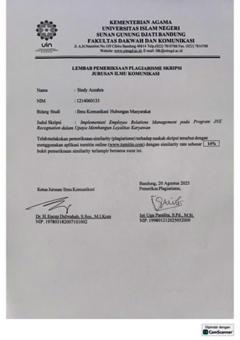 Azzahra, Sindy (2025) Implementasi Employee Relations Management pada program JNE Recognation dalam upaya membangun loyalitas karyawan: Studi kasus pada PT. Tiki Jalur Nugraha Ekakurir Bandung. Sarjana thesis, UIN Sunan Gunung Djati Bandung.