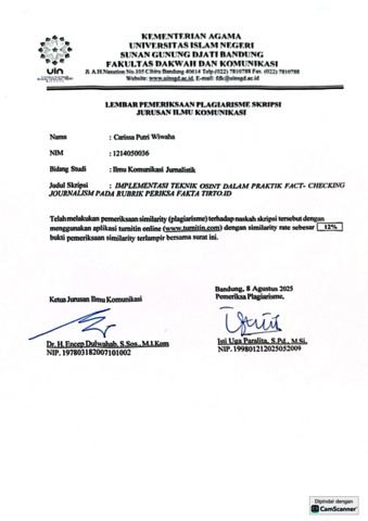 Wiwaha, Carissa Putri (2025) Implementasi teknik Osint dalam praktik Fact-Checking Journalism pada Rubrik Periksa Fakta Tirto.Id. Sarjana thesis, UIN Sunan Gunung Djati Bandung.