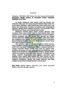 Di tengah keterbukaan ruang interaksi sosial dan derasnya arus modernitas, budaya peci dan sarung masyarakat Muslim Madura tidak serta-merta tergerus. Sebaliknya, simbol tersebut tetap lestari melalui proses yang dinamis dan dinegosiasikan. Penelitian ini bertujuan untuk mengeksplorasi bagaimana identitas dalam kehidupan sehari-hari. Teori representasi Stuart Hall mejadi Grand Theory untuk mengkaji budaya tersebut. Pendekatan kualitatif dengan metode etnografi digunakan untuk memahami budaya secara holistik, baik dari sudut pandang dalam (emic) maupun luar (etic). Teknik pengumpulan data meliputi wawancara mendalam, observasi partisipatif, dan studi pustaka. Data diperoleh dari berbagai informan dengan latar belakang profesi yang beragam, seperti tokoh agama, guru, pedagang, petani, pegawai, dan buruh yang berdomisili di Kecamatan Kamal, Kabupaten Bangkalan. Temuan ini diperkuat sumber sekunder berupa buku, jurnal, dan literatur yang relevan. Hasil penelitian, yaitu: (1) Identitas terkontruksi melalui pewarisan budaya pendidikan keluarga, pesantren, budaya dan tradisi keagamaan serta system nilai yang dimiliki Masyarakat (2) Identitas mengalami dinamika di kalangan masyarakat Madura, berbeda antara orang tua, generasi muda, pendatang, dan perantau. Peci dan sarung dipahami dan dipraktikkan secara beragam sesuai pengalaman sosial dan konteks kehidupan, sehingga identitas kultural dan keagamaan selalu dalam proses negosiasi; (3) Budaya peci dan sarung, senantiasa dinegosiasikan, baik organisasi masyarakat seperti Nahdlatul Ulama maupun negara melalui Hari Santri Nasional dan ikon Bangkalan sebagai Kota Dzikir dan Solawat. Selain itu, bentuk dan jenisnya mengalami komodifikasi, sehingga nilai budaya tradisional tetap hidup sekaligus menyesuaikan diri dengan dinamika sosial dan pasar.