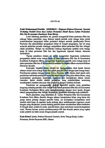 Latar belakang penelitian ini, penulis mengambil lahan pertanian Dhe iim sebagai bahan penelitian yang dimana terjadi praktik sewa tenaga kerja untuk menyelesaikan pengerjaan lahan pertanian dengan metode pembayaran Down Payment dan penambahan pengerjaan lahan di tengah pengerjaan, hal ini yang menarik perhatian penulis sehingga menjadikan lahan pertanian Dhe Iim sebagai objek penelitian. Skripsi ini membahas tentang bagaimana praktik sewa tenaga kerja di lahan pertanian Dhe Iim dan bagaimana tinjauan hukum ekonomi Syariahnya. Tujuan penulisan skripsi ini untuk mengetahui bagaimana mekanisme pengupahan dalam sewa tenaga kerja di lahan pertanian Dhe Iim di Kecamatan Kunduran Kabupaten Blora, mengetahui bagaimana praktik sewa tenaga kerja di lahan pertanian Dhe Iim di Kecamatan Kunduran Kabupaten Blora menurut Hukum Ekonomi Syariah. Kerangka berpikir dalam skripsi ini menggunakan akad Ijarah karena adanya sistem sewa tenaga kerja dari pihak pemilik lahan dengan para tenaga kerja. Pembayaran pekerja dengan sistem Down Payment (DP) dalam akad ijarah serta pemberian tambahan pekerjaan memiliki dasar hukum yang jelas dalam Islam, yang menekankan pentingnya kejelasan, keadilan, dan kesepakatan dalam semua transaksi. Ijarah sendiri adalah perjanjian yang membolehkan seseorang mendapatkan manfaat atau jasa dari pihak lain dengan imbalan tertentu. Penelirian ini menggunakan metode deskriftif analitis yaitu penelitian langsung terhadap praktik sewa tenaga kerja lahan pertanian Dhe Iim di Kecamatan Kunduran Kabupaten Blora serta mengkolerasinya dengan teori ijarah, dengan teknik pengumpulan data berupa wawancara, penelitian terhadap arsip terdahulu. Hasil penelitian yang dilakukan di Lahan Pertanian Dhe Iim Kecamatan Kunduran Kota Blora dimulai dengan adanya kesepakatan lahan yang harus din garap antara pekerja dengan pemilik lahan, ini merupakan kesepakatan awal setelah akad kerja di sepakati maka pekerja akan melaksanakan tugasnya sesuai dengan yang disepakati, namun kadang pemilik lahan memberikan lahan tambahan di Tengah akad, setelah itu maka pemilik lahan akan membayar sesuai kesepakatan awal, Namun karena system pembayarannya DP dan banyak petani yang ingkar maka praktik ini tidak sesuai dengan pripsih syariah .
