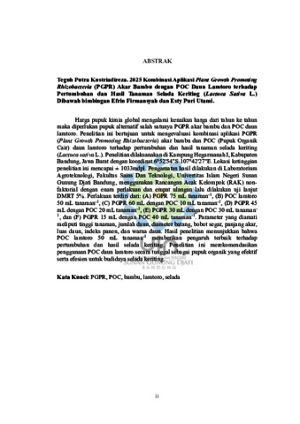 Kustriadireza, Teguh reza (2025) Kombinasi Aplikasi Plant Growth Promoting Rhizobacteria (PGPR) akar bambu dengan POC daun lamtoro terhadap pertumbuhan dan hasil tanaman selada keriting (Lactuca Sativa L.). Sarjana thesis, UIN Sunan Gunung Djati Bandung.