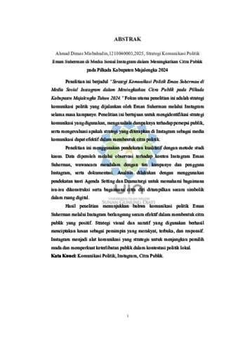 Penelitian ini berjudul “Strategi Komunikasi Politik Eman Suherman di Media Sosial Instagram dalam Meningkatkan Citra Publik pada Pilkada Kabupaten Majalengka Tahun 2024.” Fokus utama penelitian ini adalah strategi komunikasi politik yang dijalankan oleh Eman Suherman melalui Instagram selama masa kampanye. Penelitian ini bertujuan untuk mengidentifikasi strategi komunikasi yang digunakan, menganalisis dampaknya terhadap persepsi publik, serta mengevaluasi apakah strategi yang diterapkan di Instagram sebagai media komunikasi dapat efektif dalam membentuk citra politik. Penelitian ini menggunakan pendekatan kualitatif dengan metode studi kasus. Data diperoleh melalui observasi terhadap konten Instagram Eman Suherman, wawancara mendalam dengan tim kampanye dan pengguna Instagram, serta dokumentasi. Analisis dilakukan dengan menggunakan pendekatan teori Agenda Setting dan Dramaturgi untuk memahami bagaimana isu-isu dikonstruksi serta bagaimana citra diri ditampilkan secara simbolik dalam ruang digital. Hasil penelitian menunjukkan bahwa komunikasi politik Eman Suherman melalui Instagram berlangsung secara efektif dalam membentuk citra publik yang positif. Strategi visual dan naratif yang digunakan berhasil menciptakan kesan sebagai pemimpin yang merakyat, terbuka, dan responsif. Instagram menjadi alat komunikasi yang strategis untuk menjangkau pemilih muda dan memperkuat keterlibatan publik dalam kontestasi politik lokal.