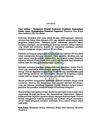 Uncontrolled Keywords: Manajemen Strategi; Kaderisasi; Pelajar Islam Indonesia; Eksistensi Organisasi