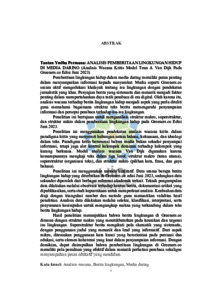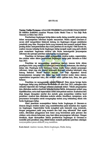 Pemberitaan lingkungan hidup dalam media daring memiliki peran penting dalam menyampaikan informasi kepada masyarakat. Media seperti Greeners.co secara aktif mengedukasi khalayak tentang isu lingkungan dengan pendekatan jurnalistik yang khas. Penyajian berita yang sistematis dan menarik menjadi faktor penting dalam mempertahankan daya tarik pembaca di era digital. Oleh karena itu, analisis wacana terhadap berita lingkungan hidup menjadi aspek yang perlu diteliti guna memahami bagaimana struktur teks berita memengaruhi penyampaian informasi dan persepsi pembaca terhadap isu-isu lingkungan. Penelitian ini bertujuan untuk menganalisis struktur makro, superstruktur, dan struktur mikro dalam pemberitaan lingkungan hidup pada Greeners.co Edisi Juni 2023. Penelitian ini menggunakan pendekatan analisis wacana kritis dalam paradigma kritis yang menyoroti hubungan antara bahasa, kekuasaan, dan ideologi dalam teks. Paradigma kritis berasumsi bahwa media bukan sekadar penyampai informasi, tetapi juga alat kontrol kelompok dominan terhadap kelompok yang kurang berkuasa. Model analisis wacana Van Dijk digunakan karena kemampuannya mengkaji teks dalam tiga level: struktur makro (tema utama), superstruktur (organisasi teks), dan struktur mikro (pilihan kata, frasa, dan gaya bahasa). Penelitian ini menggunakan metode kualitatif. Data utama berupa berita lingkungan hidup yang diterbitkan di Greeners.co edisi Juni 2023, sedangkan data sekunder diperoleh dari berbagai referensi akademik terkait. Teknik pengumpulan data dilakukan melalui observasi terhadap konten berita, dokumentasi artikel yang dipublikasikan, serta studi kepustakaan untuk memperkuat analisis. Keabsahan data diuji dengan triangulasi sumber dan metode guna memastikan validitas hasil penelitian. Analisis data dilakukan melalui seleksi, klasifikasi, interpretasi, serta penyusunan kesimpulan untuk mengungkap makna yang terkandung dalam teks berita lingkungan hidup. Hasil penelitian menunjukkan bahwa berita lingkungan di Greeners.co disusun dengan struktur makro yang menitikberatkan pada keunikan dan urgensi isu lingkungan. Superstruktur berita mengikuti pola skematik yang sistematis, dengan penggunaan judul yang menarik dan lead yang informatif. Dari aspek mikro, ditemukan penggunaan kata kunci yang berorientasi pada persuasi dan edukasi, serta elemen koherensi yang kuat dalam penyampaian informasi. Dengan demikian, dapat disimpulkan bahwa pemberitaan lingkungan di Greeners.co memiliki pola penulisan yang efektif dalam menarik perhatian pembaca sekaligus menyampaikan pesan edukatif yang mendalam.