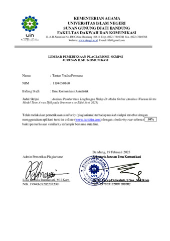 Permana, Tantan Yudha (2025) Analisis pemberitaan lingkungan hidup di media daring: Analisis wacana kritis model Teun A van Dijk pada Greeners.co edisi Juni 2023. Sarjana thesis, UIN Sunan Gunung Djati Bandung.
