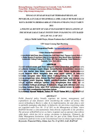 Pasya, Abiyyu Mufid Jadid and Fautanu, Idzam and Rizal, Lutfi Fahrul (2025) Tinjauan siyasah maliyah terhadap regulasi pengelolaan zakat di Lembaga Amil Zakat Rumah Zakat Kota Bandung berdasarkan Undang-undang no 23 tahun 2011. Journal Hukum Lex Generalis, 6 (8). pp. 1-25. ISSN 2746-4075