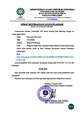 Asrori, Elsa Laesa Nur (2025) Pengaruh sikap wara’ terhadap perilaku bullying verbal pada remaja di Desa Waringin Kecamatan Palasah Kabupaten Majalengka: Studi pada remaja akhir di Desa Waringin Kecamatan Palasah Kabupaten Majalengka. Sarjana thesis, UIN Sunan Gunung Djati Bandung.