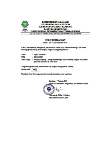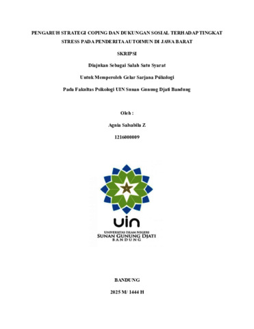 Salsabila, Agnia (2025) Pengaruh strategi Coping dan dukungan sosial terhadap tingkat stress pada penderita autoimun di Jawa Barat. Sarjana thesis, UIN Sunan Gunung Djati Bandung.