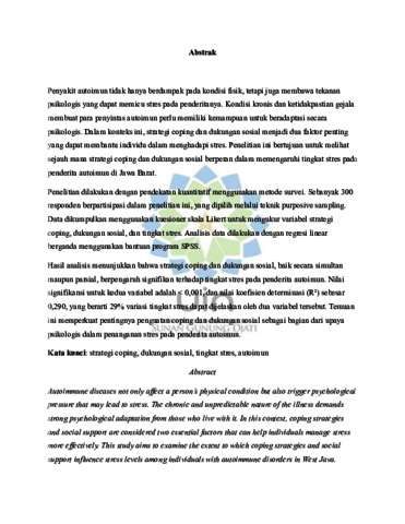 Penyakit autoimun tidak hanya berdampak pada kondisi fisik, tetapi juga membawa tekanan psikologis yang dapat memicu stres pada penderitanya. Kondisi kronis dan ketidakpastian gejala membuat para penyintas autoimun perlu memiliki kemampuan untuk beradaptasi secara psikologis. Dalam konteks ini, strategi coping dan dukungan sosial menjadi dua faktor penting yang dapat membantu individu dalam menghadapi stres. Penelitian ini bertujuan untuk melihat sejauh mana strategi coping dan dukungan sosial berperan dalam memengaruhi tingkat stres pada penderita autoimun di Jawa Barat. Penelitian dilakukan dengan pendekatan kuantitatif menggunakan metode survei. Sebanyak 300 responden berpartisipasi dalam penelitian ini, yang dipilih melalui teknik purposive sampling. Data dikumpulkan menggunakan kuesioner skala Likert untuk mengukur variabel strategi coping, dukungan sosial, dan tingkat stres. Analisis data dilakukan dengan regresi linear berganda menggunakan bantuan program SPSS. Hasil analisis menunjukkan bahwa strategi coping dan dukungan sosial, baik secara simultan maupun parsial, berpengaruh signifikan terhadap tingkat stres pada penderita autoimun. Nilai signifikansi untuk kedua variabel adalah < 0,001, dan nilai koefisien determinasi (R²) sebesar 0,290, yang berarti 29% variasi tingkat stres dapat dijelaskan oleh dua variabel tersebut. Temuan ini memperkuat pentingnya penguatan coping dan dukungan sosial sebagai bagian dari upaya psikologis dalam penanganan stres pada penderita autoimun.