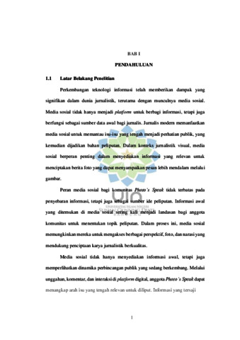 Media sosial saat ini telah menjadi ruang vital dalam praktik jurnalistik visual. Penelitian ini dilatarbelakangi oleh kasus penggunaan platform digital seperti Instagram oleh komunitas fotografi jurnalistik Photo’s Speak sebagai sumber informasi awal dalam peliputan. Peneliti tertarik untuk mengkaji bagaimana media sosial dimanfaatkan oleh para anggota komunitas tersebut Penelitian ini bertujuan untuk mendeskripsikan bagaimana proses pencarian, validasi, dan transformasi informasi dari media sosial menjadi berita foto. Selain itu, penelitian ini juga bertujuan mengungkap strategi komunitas dalam menyeleksi isu serta menjaga nilai-nilai jurnalistik dalam setiap karyanya. Metode yang digunakan adalah metode penelitian kualitatif. Data dikumpulkan melalui wawancara mendalam dengan lima narasumber di komunitas Photo’s Speak. Hasil wawancara diolah dan dianalisis dengan menyesuaikan kerangka teori media baru Pierre Lévy yang menekankan pada partisipasi, konektivitas, dan kecerdasan kolektif. Hasil penelitian menunjukkan bahwa media sosial berperan penting dalam membantu komunitas Photo’s Speak menemukan isu lokal yang relevan, aktual, melakukan validasi informasi secara cepat, dan menyusun narasi visual yang berbasis realitas lapangan. Media sosial terbukti efektif tidak hanya sebagai alat distribusi, tetapi juga sebagai sumber informasi awal.