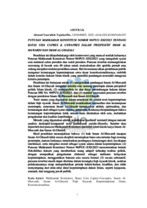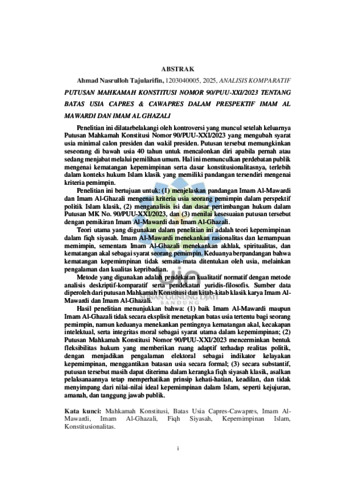 | Uncontrolled Keywords: | Mahkamah Konstitusi; Batas Usia Capres-Cawapres; Imam Al-Mawardi; Imam Al-Ghazali; Fiqh Siyasah; Kepemimpinan Islam; Konstitusionalitas |