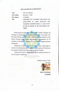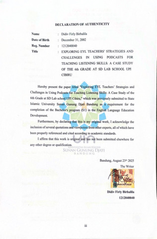 Birbalila, Didiv Firly (2025) Exploring EYL Teachers’ strategies and challenges in using podcast for teaching listening skills: A Case Study of the 6th grade at Sd Lab School UPI Cibiru. Sarjana thesis, UIN Sunan Gunung Djati Bandung.