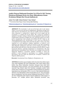 ENGLISH: The constitution is also one of the basic rules in the country which is very necessary and must be implemented. Of all forms of legal rules made based on state democracy, they must not conflict with the constitution, where democracy is nothing but a majority for all the people and the constitution is a product for all the people. This writing uses qualitative methods or literature writing or library research. Qualitative data is the type of information collected to complete this essay. This data analyzes the results of the Constitutional Court decision No.13/PUU-XV/2017 based on the Siyasah Qodhoiyyah review. On December 14 2017, there was a decision by a Constitutional Court judge which stated that the phrase "unless it has been regulated in a work agreement, company regulations, or collective work agreement" the contents of this article are contrary to the 1945 Constitution of the Republic of Indonesia which does not have binding legal force. The final outcome of this decision is that most elements of society reject or cannot accept this decision, especially entrepreneurs or entrepreneurs. The steps taken from the Constitutional Court's decision were strongly criticized by the Indonesian Employers' Association (Apindo), according to which this problem is more connected to governance in a company (corporate governance), and can reduce the potential for Corruption, Collusion and Nepotism (KKN) practices. INDONESIA: Konstitusi juga merupakan salah satu aturan dasar dalam negara yang sangat diperlukan dan harus dilaksanakan. Dari segala bentuk aturan hukum yang dibuat berdasarkan demokrasi bernegara maka tidak boleh bertentangan dengan konstitusi, yang mana demokrasi tak lain merupakan mayoritas bagi seluruh rakyat dan konstitusi merupakan produk untuk seluruh rakyat. Penulisan ini menggunakan metode Kualitatif atau penulisan kepustakaan atau studi pustaka (library research). Data kualitatif adalah jenis informasi yang dikumpulkan untuk menyelesaikan esai ini. Yang mana dalam data ini menganalisis hasil dari putusan Mahkamah Konstitusi No.13/PUU-XV/2017 berdasarkan pada tinjauan Siyasah Qodhoiyyah. Pada tanggal 14 Desember 2017 terdapat putusan hakim Mahkamah Konstitusi yang menyatakan dengan frasa “terkecuali telah diatur dalam suatu perjanjian kerja , peraturan perusahaan , ataupun perjanjian dalam kerja bersama-sama” yang mana isi dari dalam pasal tersebut bertentangan dengan Undang-Undang Dasar Republik Indonesia 1945 yang secara tidak memiliki kekuatan hukum dengan mengikat. final dari putusan ini adalah, Sebagian besar dari elemen masyarakat menolak atau tidak dapat menerima putusan tersebut, terutama dari kalangan wiraswasta atau pengusaha. Langkah dari putusan Mahkamah Konstitusi dikritik keras oleh Asosiasi Pengusaha Indonesia (Apindo) , menurutnya permasalahan ini lebih terkoneksi pada tata kelola dalam suatu perusahaan (corporate governance), dan dapat mengurangi potensi praktik Korupsi, Kolusi, dan Nepotismen (KKN).