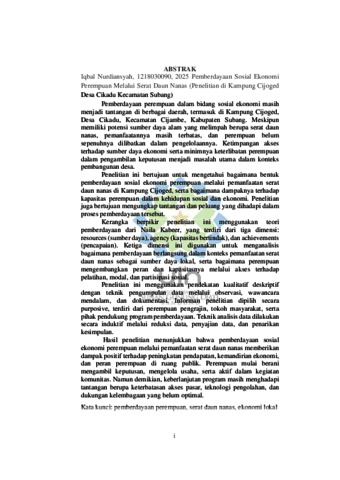 Pemberdayaan perempuan dalam bidang sosial ekonomi masih menjadi tantangan di berbagai daerah, termasuk di Kampung Cijoged, Desa Cikadu, Kecamatan Cijambe, Kabupaten Subang. Meskipun memiliki potensi sumber daya alam yang melimpah berupa serat daun nanas, pemanfaatannya masih terbatas, dan perempuan belum sepenuhnya dilibatkan dalam pengelolaannya. Ketimpangan akses terhadap sumber daya ekonomi serta minimnya keterlibatan perempuan dalam pengambilan keputusan menjadi masalah utama dalam konteks pembangunan desa. Penelitian ini bertujuan untuk mengetahui bagaimana bentuk pemberdayaan sosial ekonomi perempuan melalui pemanfaatan serat daun nanas di Kampung Cijoged, serta bagaimana dampaknya terhadap kapasitas perempuan dalam kehidupan sosial dan ekonomi. Penelitian juga bertujuan mengungkap tantangan dan peluang yang dihadapi dalam proses pemberdayaan tersebut. Kerangka berpikir penelitian ini menggunakan teori pemberdayaan dari Naila Kabeer, yang terdiri dari tiga dimensi: resources (sumber daya), agency (kapasitas bertindak), dan achievements (pencapaian). Ketiga dimensi ini digunakan untuk menganalisis bagaimana pemberdayaan berlangsung dalam konteks pemanfaatan serat daun nanas sebagai sumber daya lokal, serta bagaimana perempuan mengembangkan peran dan kapasitasnya melalui akses terhadap pelatihan, modal, dan partisipasi sosial. Penelitian ini menggunakan pendekatan kualitatif deskriptif dengan teknik pengumpulan data melalui observasi, wawancara mendalam, dan dokumentasi. Informan penelitian dipilih secara purposive, terdiri dari perempuan pengrajin, tokoh masyarakat, serta pihak pendukung program pemberdayaan. Teknik analisis data dilakukan secara induktif melalui reduksi data, penyajian data, dan penarikan kesimpulan. Hasil penelitian menunjukkan bahwa pemberdayaan sosial ekonomi perempuan melalui pemanfaatan serat daun nanas memberikan dampak positif terhadap peningkatan pendapatan, kemandirian ekonomi, dan peran perempuan di ruang publik. Perempuan mulai berani mengambil keputusan, mengelola usaha, serta aktif dalam kegiatan komunitas. Namun demikian, keberlanjutan program masih menghadapi tantangan berupa keterbatasan akses pasar, teknologi pengolahan, dan dukungan kelembagaan yang belum optimal.