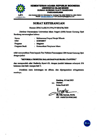 | Uncontrolled Keywords: | Prophetic Rhetoric; Da'wah; Prophetic Dimension; Mama Cianting |
