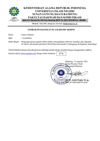 Andriani, Anisa (2025) Pengorganisasian majelis taklim dalam meningkatkan aktivitas membaca dan terjemah Al-Qur'an: Penelitian di Pondok Pesantren Nurul Iman Kecamatan Cimanggung Kabupaten Sumedang. Sarjana thesis, UIN Sunan Gunung Djati Bandung.