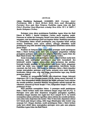 Rachmaali, Ghina Mardhiyya (2025) Penerapan model pembelajaran Make a Match berbasis media kartu untuk meningkatkan partisipasi siswa pada mata pelajaran Pendidikan Agama Islam dan Budi Pekerti: Penelitian kuasi-eksperimen terhadap siswa kelas VII C di SMPN 2 Sumber Kabupaten Cirebon. Sarjana thesis, UIN Sunan Gunung Djati Bandung.
