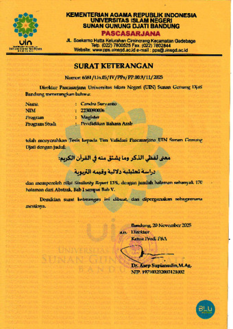 Suryanto, Candra (2025) Makna lafadz "Adzikru" serta derivasinya dalam Al-Qur'anul Karim: Studi analisis semantik dan nilai-nilai pendidikannya. Masters thesis, UIN Sunan Gunung Djati Bandung.