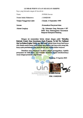 Irawan, M Rifki (2024) Retorika dakwah Ustadz Oom Surachman pada program Ta'rief wa Tafhimul Qur'an pada kajian Tafsir Asy Sya'rawi. Sarjana thesis, UIN Sunan Gunung Djati Bandung.