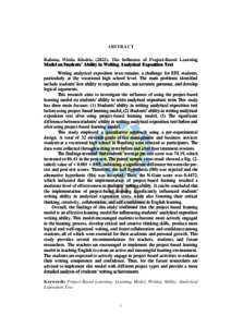 Writing analytical exposition texts remains a challenge for EFL students, particularly at the vocational high school level. The main problems identified include students’ low ability to organize ideas, use accurate grammar, and develop logical arguments. This research aims to investigate the influence of using the project-based learning model on students’ ability to write analytical exposition texts This study has three main focuses: (1) Students’ ability in writing analytical exposition text before using project-based learning model (2) Students’ ability in writing analytical exposition text after using project-based learning model, (3) The significant difference between students’ ability in writing analytical exposition text before and after using project-based learning model. This study employed a quantitative approach using a pre-experimental design. A total of 32 eleventh-grade office management and business services students at a vocational high school in Bandung were selected as participants. The data were collected through writing tests before and after four treatment sessions. The findings revealed that students’ average pre-test score was 74.19, which increased to 86.41 in the post-test. The paired sample t-test result showed a Sig. (2-tailed) value of < 0.001 < 0.05, indicating a significant difference between the pretest and post-test scores. Therefore, the null hypothesis (H0) was rejected and the alternative hypothesis (Ha) was accepted. Then, the N-Gain score was 0.4472, which indicated that the implementation of project-based learning resulted a moderate level of effectiveness in students’ writing ability. It can be concluded that the implementation of project-based learning significantly influenced students’ writing ability in analytical exposition texts, while also fostering their critical thinking, creativity, collaboration, and self-confidence in English learning. Overall, the findings of this study confirmed that the project -based learning model is an effective learning model for influencing students’ analytical exposition writing ability. This model encouraged students to become more actively engaged in the learning process, develop critical and creative thinking skills, produce more logical and well-organized writing, and foster collaboration and confidence among students, all of which were essential for their academic and personal growth. This study provides several recommendations for teachers, students, and future researchers. The teachers are encouraged to implement the project-based learning model in teaching English to create an active and meaningful learning environment. The students are expected to actively engage in project-based activities to enhance their writing competence and confidence. Then, for the future researchers are advised to implement this model with different project types and provide a more detailed analysis of students’ writing achievements.