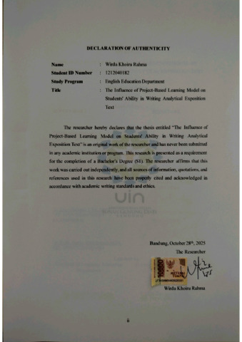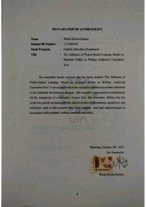 Rahma, Wirda Khoiru (2025) The influence of project-based learning model on students' ability in writing analytical exposition text. Sarjana thesis, UIN Sunan Gunung Djati Bandung.