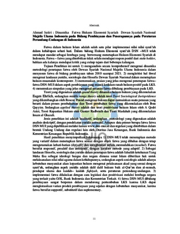 INDONESIA: Fatwa dalam hukum Islam adalah salah satu pilar implementasi nilai nilai syari’ah dalam kehidupan sehari hari. Dalam bidang Hukum Ekonomi syari’ah DSN –MUI telah mendapat mandat sebagai lembaga yang berwenang menetapkan Hukum Ekonomi Syariah di Indonesia. Fatwa – fatwa yang diterbitkan tidak selalu mendapat respon positif dari stake holder, bahkan ada kalanya mendapat kritik yang cukup tajam dari beberapa kalangan. Tujuan Penelitian ini untuk 1) menganalisis secara komprehensif mengenai dinamika metodologi penetapan fatwa oleh Dewan Syariah Nasional Majelis Ulama Indonesia dalam menyusun fatwa di bidang pembiayaan tahun 2010 saampai 2021. 2) mengkritisi hal ihwal mengenai landasan yuridis, sosiologis dan filosofis Dewan Syariah Nasional dalam menetapkan hukum muamalah kontemporer. 3) merumuskan uraian yang jelas mengenai penerapan fatwa–fatwa DSN-MUI dalam aspek pembiayaan yang masuk kedalam ranah hukum positif pada LKS. 4) menemukan simpulan yang jelas mengenai peranan fatwa dibidang pembiayaan pada LKS. Teori yang digunakan adalah grand theory dinamika hukum hukum yang dikemukakan Eugen Ehrlich, sedangkan middle range theory adalah teori Teori Sociological Jurispridence yang dikembangkan oleh Roscoe Pound mengenai hukum dapat memainkan suatu peranan yang berarti dalam proses pembaharuan dan Teori perubahan fatwa yang dikemukakan oleh Ibnu Qayyim. Sedangkan applied theory adalah dan teori positivisasi hukum Islam oleh A Qodri Azizi, Teori Kepastian Hukum oleh Gustav Radbruch dan Teori Maslahah yang dikemukakan Imam al Ghazali. Jenis penelitian ini adalah kualitatif, sedangkan metodologi yang digunakan adalah analisis deskriptif, dengan pendekatan yuridis normatif. Adapun data primer berupa fatwa fatwa DSN MUI yang dipublikasi melalui laman www.dsn-mui.id dan regulasi yang diterbitkan dalam bentuk Undang Undang dan regulasi lain oleh Otoritas Jasa Keuangan, Bank Indonesia dan Kementrian Keuangan Republik Indonesia. Hasil penelitian menyimpulkan bahwasanya 1) DSN-MUI telah menerapkan metode yang variatif dalam menetapkan fatwa sesuai dengan objek fatwa yang dibahas dengan tetap mengutamakan kehati-hatian (ihtiyath) dan menghindari terlalu memudahkan (tasahul). Fatwa bersifat responsif, proaktif dan antisipatif, dengan karakter metode yang adaptif. 2) Sebagai landasan filosofis, sosiologis dan yuridis dalam penetapan fatwa adalah falsafah ketuhanan Yang Maha Esa sebagai ideologi bangsa dan negara dimana umat Islam diberikan hak untuk melaksanakan nilai nilai agama dalam kehidupannya, sedangkan aspek sosiologis adalah adanya kebutuhan masyarakat akan kepastian hukum mengenai pelaksanaan akad yang sesuai dengan syari’ah, sedangkan aspek yuridis adalah dalil dalil hukum baik al-Qur’an dan al-sunnah, pendapat ulama dan kaidah– kaidah fiqhiyah, serta peraturan perundang-undangan. 3) implementasi fatwa dilakukan dengan cara legislasi dan positivisasi melalui lembaga negara yang terkait yaitu OJK, Bank Indonesia dan Kementrian Terkait. 4) fatwa DSN-MUI dibidang pembiayaan sangat berperan dalam mendorong pertumbuhan LKS karena LKS dapat mengkreasikan varian produk pembiayaan yang sejalan dengan kebutuhan masyarakat, karena fatwa bersifat supportif, substitutif dan suplementary. ENGLISH: ملخص احمد شاطري ; تعديلات على فتوى الاحكام الاقتصادي الشرعي للمجلس الشرعي الوطني التابع لمجلس العلماء الإندونيسي في مجال التمويل وتطبيقه على التقنين في إندونيسيا تعتبر الفتوى في الشريعة الإسلامية أحد ركائز تطبيق القيم الشرعية في الحياة اليومية. في مجال القانون الاقتصادي الشرعي، حصلت الهيئة الشرعية الوطنية لمجلس العلماء الإندونيسي على تفويض كمؤسسة تتمتع بسلطة تحديد القانون الاقتصادي الشرعي في إندونيسيا. وفي سياق الفتاوى الصادرة، لم تكن الفتاوى التي صدرت تلقى دائمًا استجابة إيجابية من الجهات المعنية، بل إنها تلقت في بعض الأحيان انتقادات حادة من عدة مجموعات. الهدف من هذا البحث هو 1(.التحليل الشامل لديناميكية منهجية تحديد الفتاوى من قبل المجلس الشرعي الوطني التابع لمجلس العلماء الإندونيسي في إعداد الفتاوى في مجال التمويل في اقتصاديات الشريعة. (2. نقد الأمور المتعلقة بالأسس الفقهية والاجتماعية والفلسفية للمجلس الشرعي الوطني في إرساء قانون المعاملات المعاصر. 3(. صياغة وصف واضح لتحول فتاوى الهيئة الشرعية الوطنية لمجلس العلماء الإندونيسي في الجانب التمويلي الذي يدخل في مجال القانون الوضعي. 4(. التوصل إلى استنتاجات واضحة بشأن استراتيجية وتنفيذ فتاوى الهيئة الشرعية الوطنية لمجلس العلماء الإندونيسي في الأنظمة التشريعية. النظرية المستخدمة هي النظرية الكبرى ديناميكيات القانون كما اقترحها يوجين إيرليش، بينما النظرية المتوسطة هي نظرية الفقه الاجتماعي التي وضعها روسكو باوند، والتي تتناول دور القانون في عملية التجديد، ونظرية تغيير الفتوى التي اقترحها ابن القيم. أما النظرية التطبيقية فهي نظرية وضع الشريعة الإسلامية التي اقترحها عبد القادر عزيزي، ونظرية اليقين القانوني التي اقترحها غوست