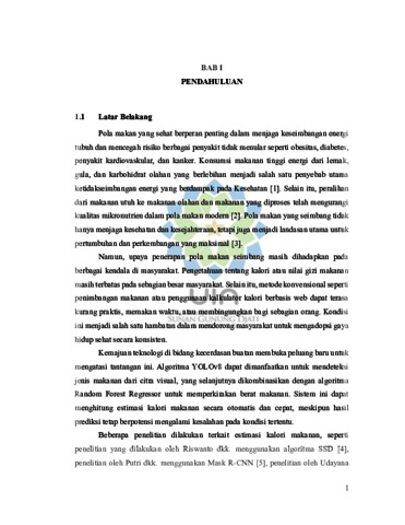 Pola makan sehat memiliki peran penting dalam menjaga keseimbangan energi tubuh dan mencegah berbagai penyakit tidak menular seperti obesitas, diabetes, penyakit kardiovaskular, dan kanker. Namun, pengetahuan masyarakat tentang kalori atau nilai gizi makanan masih terbatas, sementara metode konvensional seperti penimbangan makanan atau kalkulator kalori berbasis web kurang praktis untuk digunakan. Penelitian ini bertujuan untuk mengembangkan sistem berbasis algoritma YOLOv8 yang dapat mendeteksi jenis makanan dari citra visual dan mengestimasi kalorinya secara otomatis menggunakan algoritma Random Forest Regressor. Penelitian ini difokuskan pada makanan yang umum dikonsumsi masyarakat Indonesia, seperti nasi putih, mie, ayam fillet, dan tumisan, yang karakteristiknya memungkinkan estimasi volume berbasis kedalaman. Sistem ini telah berhasil diimplementasikan pada perangkat smartphone dan dapat melakukan deteksi serta estimasi kalori, sehingga memberikan solusi praktis bagi pengguna dalam memperkirakan asupan kalori makanan. Berdasarkan hasil evaluasi, model YOLOv8 mencapai mAP@50 sebesar 94,6% untuk segmentasi (mask) dan precision sebesar 99,8%, sedangkan model Random Forest untuk estimasi berat makanan menghasilkan MAE sebesar 10,20 gram dan MAPE sebesar 9,61%.