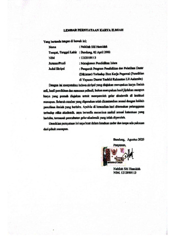 Hamidah, Nabilah Siti (2025) Pengaruh program Pendidikan dan Pelatihan Dasar (Diklatsar) terhadap etos kerja pegawai: Penelitian di Yayasan Daarut Tauhiid Rahmatan Lil Aalamiin. Sarjana thesis, UIN Sunan Gunung Djati Bandung.