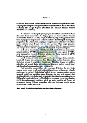 Penelitian ini berfokus pada peran program Pendidikan dan Pelatihan Dasar (Diklatsar) dalam membentuk etos kerja pegawai di Yayasan Daarut Tauhiid Rahmatan Lil Aalamiin (YDTR). Program Diklatsar yang diselenggarakan setiap tahun bagi pegawai tetap maupun kontrak tidak hanya diarahkan pada peningkatan pengetahuan dan keterampilan, tetapi juga pada penanaman nilai-nilai spiritual dan profesionalisme sesuai dengan visi dan misi yayasan. Akan tetapi, pengaruh Diklatsar dalam membentuk etos kerja pegawai tersebut lebih banyak dipandang dari persepsi positif internal yayasan dan belum pernah diuji secara empiris. Oleh karena itu, penelitian ini bertujuan untuk mendeskripsikan pelaksanaan program Diklatsar di YDTR, menggambarkan kondisi etos kerja pegawai di YDTR, serta menganalisis pengaruh Diklatsar terhadap etos kerja pegawai di YDTR berdasarkan data kuantitatif yang terukur. Untuk mencapai tujuan tersebut, penelitian ini menggunakan pendekatan kuantitatif dengan metode survei. Data dikumpulkan melalui kuesioner yang disebarkan kepada 84 responden. Analisis data dilakukan dengan uji validitas, reliabilitas, uji asumsi klasik (normalitas dan linearitas), analisis regresi linear sederhana, koefisien determinasi serta uji hipotesis. Hasil penelitian menunjukkan bahwa program Diklatsar dan etos kerja pegawai secara umum berada pada kategori tinggi, dengan nilai rata-rata 4,0 pada masing-masing variabel. Selanjutnya, analisis regresi mengungkapkan adanya pengaruh positif dan signifikan antara Diklatsar dan etos kerja dengan nilai signifikansi 0,000. Lebih lanjut, hasil uji koefisien determinasi menunjukkan bahwa Diklatsar berkontribusi sebesar 44,5% terhadap pembentukan etos kerja, sedangkan 55,5% sisanya dipengaruhi oleh faktor lain di luar model penelitian ini. Temuan ini menegaskan bahwa Diklatsar merupakan salah satu instrumen penting dalam meningkatkan etos kerja pegawai.