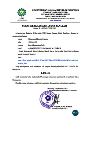 Pratama, Fardan (2025) Asbabun nuzul pada QS. Ali Imran: Studi komparatif kitab Lubabun Nuqul karya As-Suyuthi dan kitab Asbabun Nuzul karya Al-Wahidi. Sarjana thesis, UIN Sunan Gunung Djati Bandung.