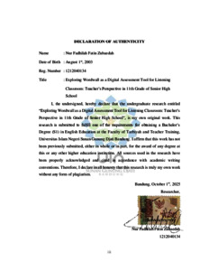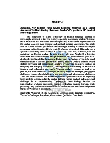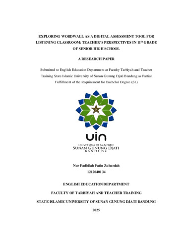 Zubaedah, Nur Fadhilah Fatin (2025) Exploring Wordwall as a digital assessment tool for listening classroom: Teacher's perspectives in 11th Grade of Senior High School. Sarjana thesis, UIN Sunan Gunung Djati Bandung.