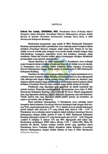 Berdasarkan pengamatan yang terjadi di SMA Darmayanti Kabupaten Bandung menunjukkan bahwa pemahaman siswa terhadap materi kompetisi dalam kebaikan (Fastabiqul Khairat) sebagian sudah cukup baik. Namun di sisi lain, akhlak siswa di sekolah pada sebagian siswa masih rendah, ditandai dengan sikap individualisme, kurangnya kepedulian sosial, dan lemahnya semangat saling membantu. Dalam hal tersebut terlihat adanya kesenjangan sekaligus melahirkan permasalahan yang menarik untuk diteliti. Tujuan penelitian ini untuk mengetahui: 1) Pemahaman siswa terhadap materi kompetisi dalam kebaikan (Fastabiqul Khairat), 2) Akhlak siswa di sekolah, 3) Pemahaman siswa terhadap materi kompetisi dalam kebaikan (Fastabiqul Khairat) hubungannya dengan akhlak mereka di sekolah kelas X SMA Darmayanti Kabupaten Bandung. Penelitian ini didasarkan pada pemikiran bahwa tingkat pemahaman siswa terhadap materi kompetisi dalam kebaikan (Fastabiqul Khairat) akan dipengaruhi oleh seberapa baik tingkat akhlak seorang siswa. Oleh karena itu, hipotesis yang diajukan adalah semakin tinggi pemahaman siswa terhadap materi kompetisi dalam kebaikan (Fastabiqul Khairat) maka semakin tinggi akhlak mereka di sekolah. Pendekatan yang digunakan pada penelitian ini adalah kuantitatif dan metode korelasi. Responden pada penelitian ini merupakan siswa kelas X SMA Darmayanti Kabupaten Bandung yang berjumlah 90 siswa. Teknik pengumpulan data yang digunakan adalah tes, angket, observasi, wawancara, dan studi dokumen. Teknik analisis data yang digunakan adalah analisis parsial, uji normalitas, uji regresi, uji korelasi, dan uji hipotesis. Hasil penelitian menunjukkan: 1) Pemahaman siswa terhadap materi kompetisi dalam kebaikan (Fastabiqul Khairat) berkategori baik dengan nilai rata-rata 78,01 yang berada pada interval 70 – 79. 2) Akhlak siswa di sekolah berkategori positif dengan nilai rata-rata 3,77 yang berada pada interval 3,40 – 4,19. 3) Pemahaman siswa terhadap materi kompetisi dalam kebaikan (fastabiqul khairat) hubungannya dengan akhlak mereka di kelas X SMA Darmayanti Kabupaten Bandung berkategori lemah 0,37 yang berada pada interval 0,21 – 0,40. Pengaruh variabel X terhadap Y sebesar 11% dan 89% dipengaruhi oleh faktor lain. Berdasarkan perhitungan SPSS bahwa thitung 3,235 > ttabel1,988. Maka Ha diterima Ho ditolak. Artinya terdapat korelasi positif yang signifikan antara Pemahaman Siswa Terhadap Materi Kompetisi dalam Kebaikan (Fastabiqul Khairat) Hubungannya dengan Akhlak Mereka di kelas X SMA Darmayanti Kabupaten Bandung.