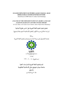 ARABIC: إسما فوزية: تحليل تنفيذ تعليم اللغة العربية على أساس نظرية البنائية (دراسة حالة في مدرسة الأزهر القاهرة الإسلامية المتوسطة باندونج). مدرسة الأزهر القاهرة الإسلامية المتوسطة باندونج هي إحدى المدارس التي طبّقت نظرية البنائية في عمليّة التعليم. ولا يقتصر هذا التطبيق على المواد العامة فحسب، بل تطبيق في تعليم اللغة العربية أيضا. وذلك جدير بالدراسة لأنّ البنائية تركّز على فاعلية الطلاب في بناء معارفه. خاصة في اثناء متطلبات عالم التربية الحالي الذي يتجه نحو التخلي عن الأساليب التقليدية والاتجاه إلى نهج يركز على الطلاب. فأما اهداف هذا البحث فهو: 1) معرفة كيفية تطبيق نظرية البنائية في تخطيط تعليم اللغة العربية في مدرسة الأزهر القاهرة الإسلامیة المتوسطة باندونج. 2) معرفة كيفية تطبيق نظرية البنائية في عملية تعليم اللغة العربية في مدرسة الأزهر القاهرة الإسلامیة المتوسطة باندونج. 3) معرفة كيفية تطبيق نظرية البنائية في تقييم تعليم اللغة العربية في مدرسة الأزهر القاهرة الإسلامیة المتوسطة باندونج. 4) معرفة العوامل الداعمة و المعيقة لتطبيق نظرية البنائية في تعلم اللغة العربية بمدرسة الأزهر القاهرة الإسلامیة المتوسطة باندونج. ومن المتوقّع أن يقدّم هذا البحث صورة شاملة عن دينامية تطبيق النظرية البنائية في الميدان. ويرتكز الإطار النظري لهذا البحث على نظرية البنائية التي ترى أن المعرفة تُبنى بنشاط من قبل الطلاب من خلال الخبرة والتفاعل الاجتماعي والتأمل. وفي سياق تعليم اللغة العربية، طُبّقت هذه النظرية عبر ثلاث مراحل: الاستكشاف، وإعادة الهيكلة، والتطبيق. وتتكامل هذه المراحل مع مهارات القرن -21: التفكير الناقد، والإبداع، والتعاون، والتواصل، مما يدعم تعلّمًا أكثر فاعلية وذا معنى للطلاب. تعتمد هذه الدراسة على منهج نوعي بطريقة دراسة الحالة التي أُجريت في مدرسة الأزهر القاهرة الإسلامية المتوسطة باندونج. أما جمع البيانات من خلال الملاحظة بالمشاركة، والمقابلات العميقة مع مدير المدرسة، ونائب مدير المدرسة لشؤون المناهج، ومعلمة اللغة العربية، وعدد من الطلاب، وكذلك من خلال الوثائق المتمثلة في وحدات التعليمية، والخطط الدراسية، والمناهج، وسائر الوثائق المدرسية الأخرى. ثم حُلّلت باستعمال نموذج التحليل التفاعلي Miles & Huberman وأجري التحليل بطريقة وصفية وكيفية بوسيلة ثلاث مراحل: تخفض البيانات وعرضها واستخلاص النتائج. أُجري التحليل بطريقة استقرائية منذ ما قبل النزول إلى الميدان، وأثناء البحث، وحتى المرحلة النهائية، وذلك للحصول على صورة شاملة عن تنفيذ تعليم اللغة العربية على أساس نظرية البنائية. و للتأكد من صحة البيانات، طبقت هذه الدراسة التثلث المصادر والتقنيات والوقت. ومن خلال هذا النمط، يُتوقع أن تسهم نتائج البحث في تقديم وصف عميق وشامل لاستراتيجيات المعلم، وعملية التعليم، ومشاركة الطلاب في تعليم اللغة العربية. نتائج البحث المحولة فهي: 1) التخطيط للتعليم قد صُمّم بطريقة منهجية من خلال إعداد وحدات تعليمية تتضمّن الأهداف والطرائق والوسائل والتقويم على أساس النظرية البنائية. 2) وأجري تنفيذ التعليم بفاعلية متمحورة حول الطلاب من خلال المناقشات والعروض والمشروعات الرقمية والتأمل. 3) لقد نُفِّذَ التقييم في تعليم اللغة العربية لنظرية البنائية، وذلك من خلال التقييم التشخيصي، والتكويني، والختامي القائم على الوسائط الرقمية، بالإضافة إلى التقييم الأصيل مثل ممارسة المحادثة، والعرض الشفوي، والمناقشة الجماعية، والأنشطة التأملية. ومع ذلك، فإن بعض أشكال التقييم الأخرى مثل ملفّ الإنجاز والمشروعات الرقمية لم تُطبَّق بعدُ بصورة مثالية، مما يجعل تنفيذها لا يزال بحاجة إلى تحسين. 4) و العوامل الداعمة فتشمل سياسة المدرسة المنفتحة، وتوافر المرافق، ودمج التكنولوجيا. وأما العوامل المعيقة فتتمثّل في محدودية البيئة اللغوية، وضعف الثقة بالنفس لدى الطلاب، وكثرة تغيّر المعلّمين. ENGLISH: Al-Azha