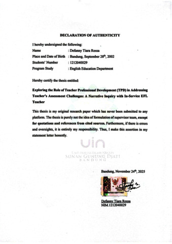 Rossa, Defanny Tiara (2025) Exploring the role of teacher professional development (TPD) in addressing teacher’s assessment challenges: A narrative inquiry with in-service EFL teacher. Sarjana thesis, UIN Sunan Gunung Djati Bandung.